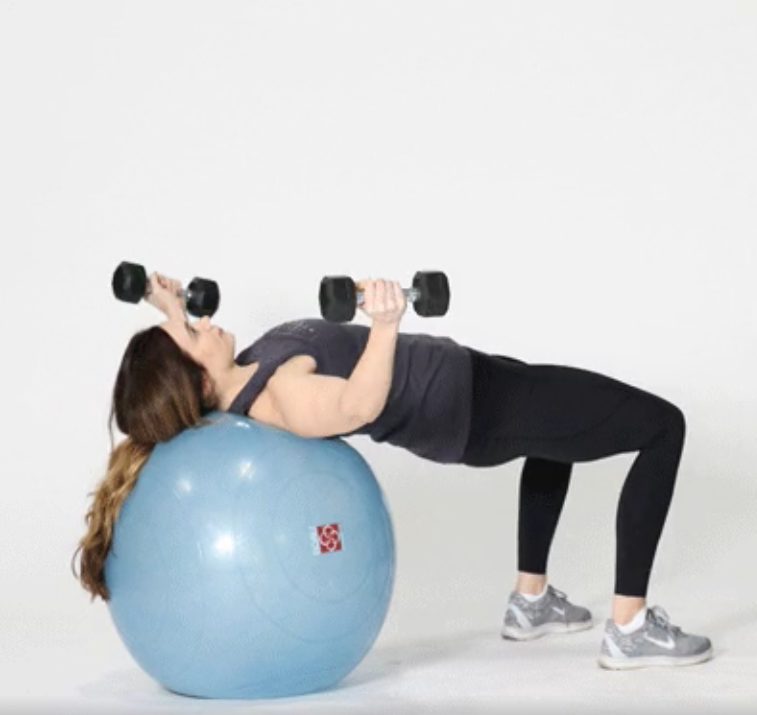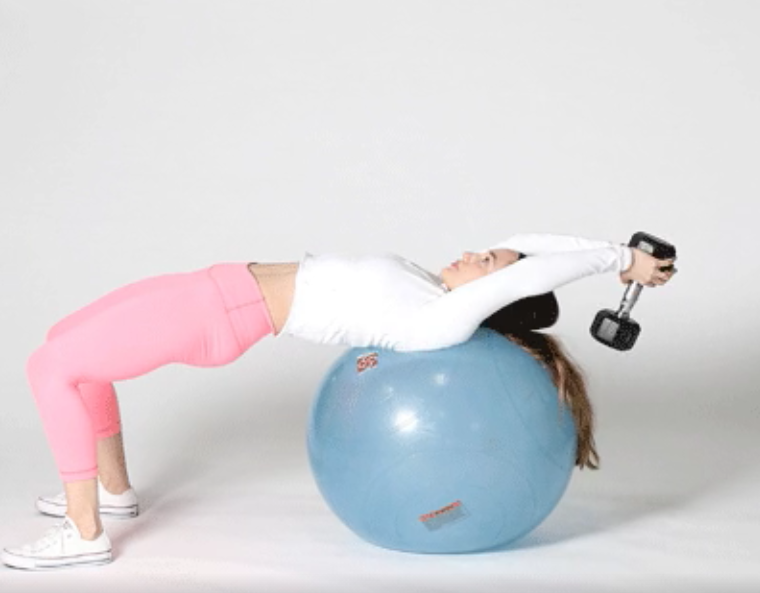 The same position on the ball, the dumbbells in both hands and the abdomen stretched out. Extend your arms with the palms facing upwards and with a slight flexion in the elbow. The arms should be parallel to the floor to start. Start lifting both dumbbells to the middle line, hearing the muscles that work. When you get to the center, slowly slow your hands, reaching the original location until you hear an elongation in the chest. Perform three sets of 12 repetitions.
