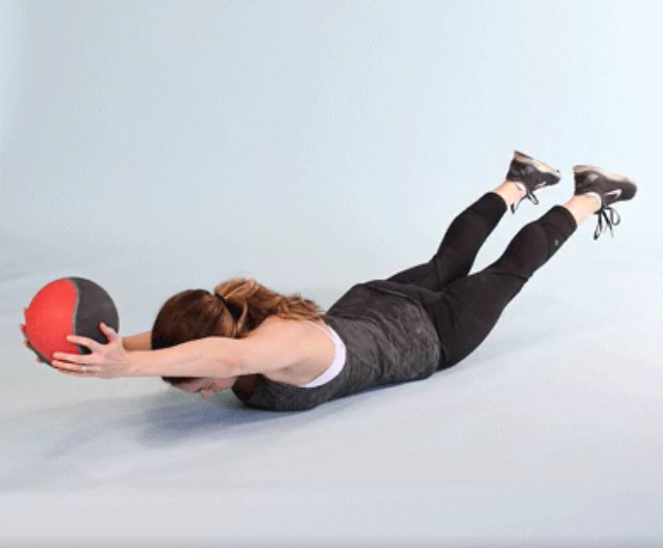From the position lying on the belly, the hands and feet extended. In the hands take a medicinal ball, raise your hands and feet at the same time, sit 2 seconds and go back to the original position. It is a good exercise for both the upper part of the body and for buttocks and abdomen. Perform three sets of 12 repetitions.