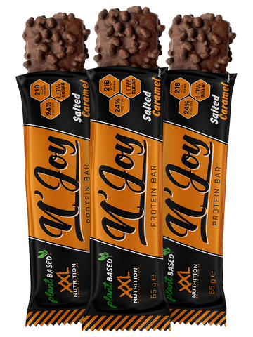 N’Joy Vegan Protein Bar is a delicious vegetable protein bar. This bar contains a mixture of soy, pea and rice protein, which gives a percentage of protein of 24 %. N’Joy Vegan Protein Bar also contains a crunchy outline that has nothing to envy for well -known – and less responsible snack bars. It is now available in the delightful flavor of salty caramel.